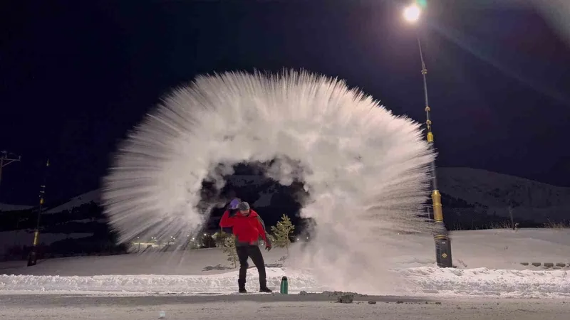 Erzurum’da kaynar su havada dondu