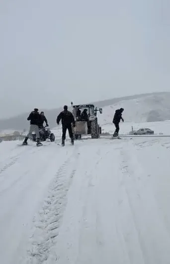 Kar yağışını fırsata çeviren gençler, soğuk havaya aldırış etmeden eğlenceli anlar yaşadı. Yoğun kar yağışının ardından beyaza bürünen bölgede bir araya gelen gençler, traktörün arkasına bağladıkları kayakla kayarak karın keyfini çıkardı.