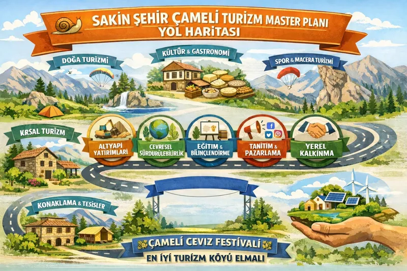 Denizli'nin "Sakin Şehir Çameli" ilçesinde 2026-2030 yılları için somut olarak belirlenen çalışmalar doğrultusunda planlanan eylemler, kimlerin hangi süreçte neler yapacağı, hedeflerden sorumlu ve iş birliği yapılacak kurum ve kuruluşlar ortaya kondu. Ayrıca sürdürülebilirlik temel yaklaşımıyla, kurum ve kuruluşların görüşlerinin alındığı çalışmada bölgede yaşayanların beklentilerini gözeterek, bugünü ve geleceği birlikte dikkate alan anlayış ile stratejileri ve eylem planları oluşturuldu.