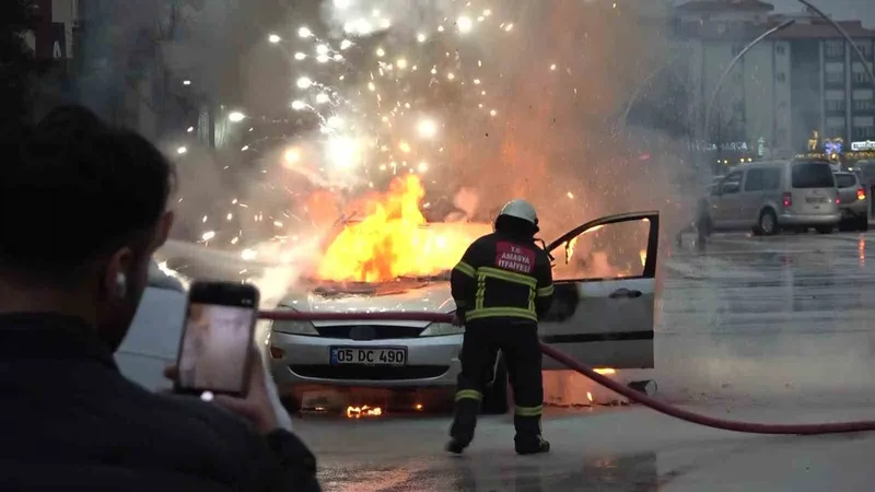 Amasya’da otomobil alev alev yandı, patlamalar korkuttu