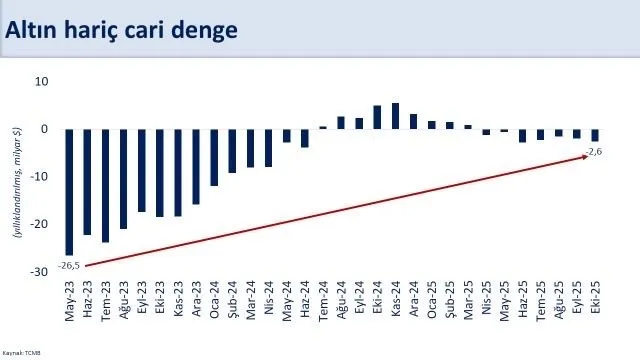 "Ekim ayında cari denge 0,5 milyar dolar fazla verdi. Yıllık cari açık 22 milyar dolar ile sürdürülebilir seviyelerde kalmaya devam etti. Altın hariç cari açık program döneminde belirgin şekilde iyileşti. Tasarruf tercihlerinde önemli yeri olan ve son dönemde fiyatı yükselen altın, artan dış ticaret açığında etkili oldu. Ekim ayında altın hariç cari denge 3,2 milyar dolar fazla verirken yıllık açık 2,6 milyar dolar gerçekleşti. Enerji fiyatlarındaki olumlu görünüm ve ihracat performansımızın cari dengeyi desteklemesi beklenirken elde ettiğimiz kazanımları kalıcı hale getirmek için yapısal reformları kararlılıkla uygulamaya devam edeceğiz."