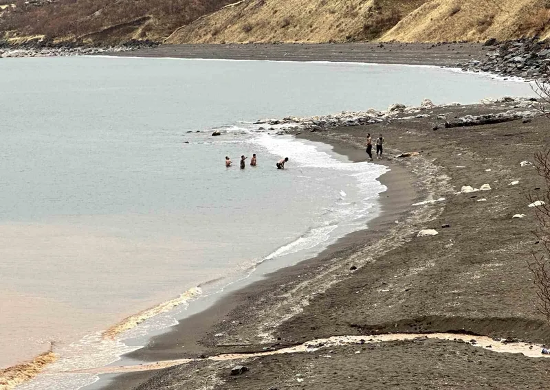 Bitlis’te yüksek kesimlerde kar nedeniyle araçlar yolda kalırken, Van Gölü kıyısını kullanan vatandaşlar ise mangal yapıp suya girdi.