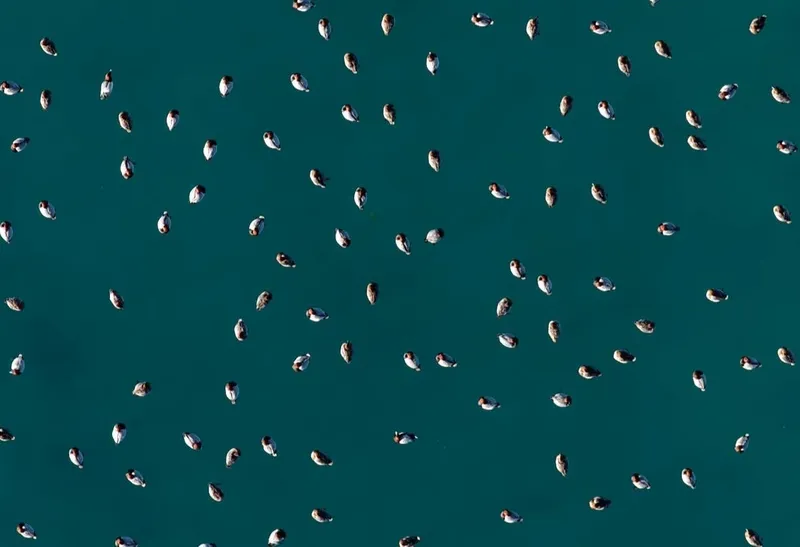 Burdur’un Yeşilova ilçesinde yer alan Salda Gölü’nde göç döneminde bölgeye gelen elmabaş patka ördekleri havadan görüntülendi.