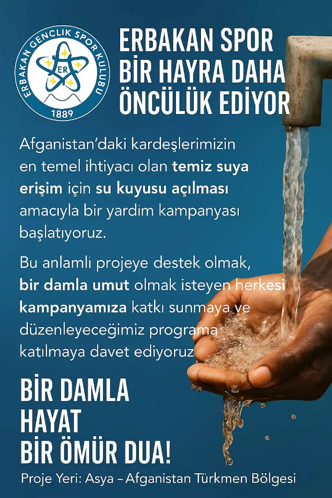 Erbakan Gençlik Spor Kulübü, sadece spor alanında değil, aynı zamanda sosyal sorumluluk projelerinde de örnek olmaya devam ediyor. 2021 yılından bu yana yürüttüğü birçok hayır çalışmasıyla dikkat çeken kulüp, son olarak Afganistan’daki Türkmen Köyü için su kuyusu açtırarak bölge halkına temiz içme suyu ulaştırdı.
