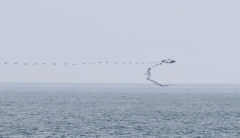 Artvin’in Hopa ilçesinde kaydedilen görüntüler, Karadeniz kıyı hattındaki göçmen kuş hareketliliğini bir kez daha görüntülendi. Göç yolculuğu sırasında göçmen kuşların sergilediği senkronize uçuş hareketleri, Hopa açıklarında deniz yüzeyine yakın şekilde görüntülendi.