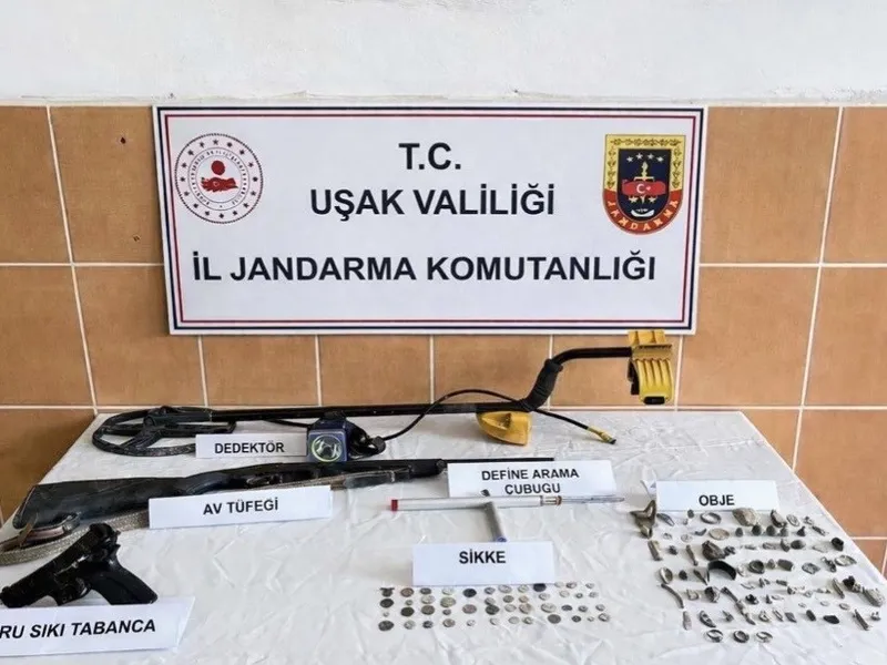 Uşak İl Jandarma Komutanlığınca, kaçakçılık olaylarını önlemek amacıyla yürütülen çalışmalar kapsamında, Ulubey ilçesine bağlı Küçükkayalı köyünde ikamet eden 53 yaşındaki H.S.’nin evine operasyon düzenlendi. Adreste yapılan aramalarda, 48 adet Osmanlı dönemine ait sikke, 75 adet tarihi obje, 7 adet 7.65 mm tabanca fişeği, 1 adet dedektör, 1 adet define aramak amacıyla kullanılan metal çubuk ile 1 adet kuru sıkı tabanca ele geçirildi.