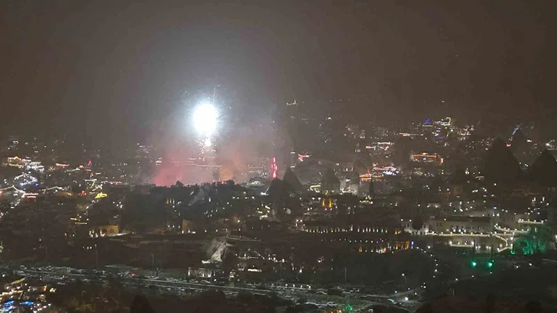 UNESCO Dünya Doğal ve Kültür Mirası Listesi’nde yer alan ve her yıl milyonlarca turist ağırlayan Kapadokya, bu yılbaşında da doldu. Bölgeye akın eden yerli ve yabancı turistler, yeni yıla saatler kala eğlence merkezlerine akın etti. Görsel şölen oluşturan havai fişek gösterileri dron ile görüntülendi.