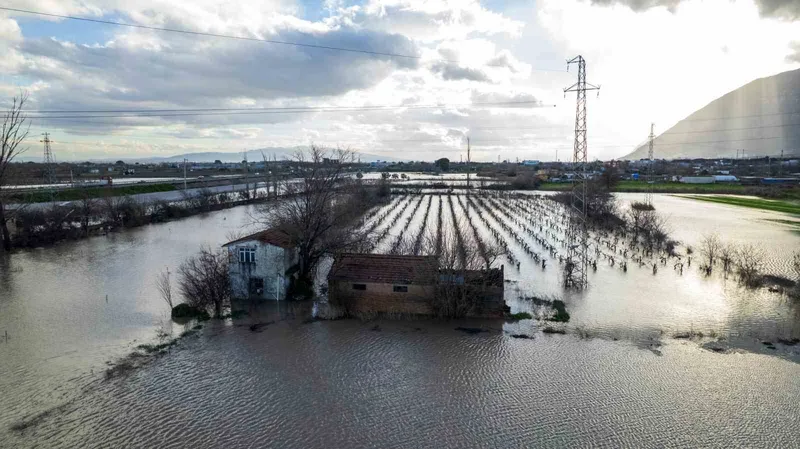 Gecenin karanlığında yaşanan taşkının boyutu, sabahın ilk ışıklarıyla birlikte havadan ve karadan çekilen görüntülerle ortaya çıktı. İzmir-Manisa çevre yolu çevresinde bulunan geniş tarım arazileri sular altında kalarak adeta göle dönerken, bölgedeki bir hayvan damı da taşkın sularından ciddi şekilde etkilendi. Dün akşam dereye düşen otomobilin ise ağaçların arasına sıkışmış hali gün yüzüne çıktı. Aracın bulunduğu yerden çıkarılması için suyun şiddetinin azalması bekleniyor.