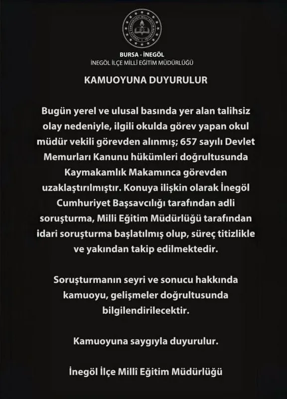İlçe Milli Eğitim Müdürlüğünden yapılan yazılı açıklamada, "Bugün yerel ve ulusal basında yer alan talihsiz olay nedeniyle ilgili okulda görev yapan okul müdür vekili görevden alınmış; 657 sayılı Devlet Memurları Kanunu hükümleri doğrultusunda kaymakamlık makamınca görevden uzaklaştırılmıştır. Konuya ilişkin olarak İnegöl Cumhuriyet Başsavcılığı tarafından adli soruşturma, Milli Eğitim Müdürlüğü tarafından idari soruşturma başlatılmış olup, süreç titizlikle ve yakından takip edilmektedir. Soruşturmanın seyri ve sonucu hakkında kamuoyu, gelişmeler doğrultusunda bilgilendirilecektir" denildi.