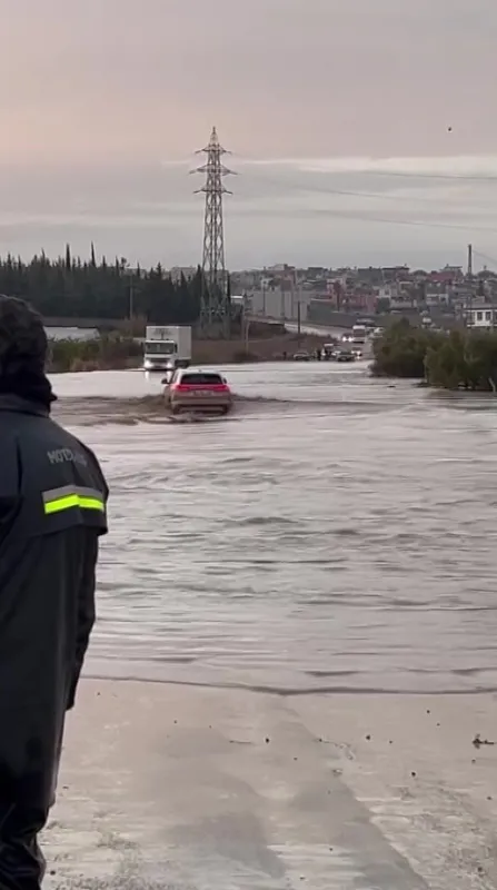 Adana’da şiddetli yağış sonucu oluşan su birikintisinden araçlar geçemezken bir TOGG suların içinde ilerledi. O anlar cep telefonu kamerasıyla görüntülendi.