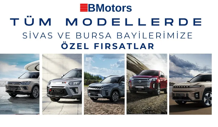 Hayalinizdeki SsangYong modeline kavuşmak, tüm modelleri online incelemek ve güncel kampanyalar hakkında net bilgi almak için BMotors SsangYong KGM Yetkili Bayi resmi web sitesini ziyaret edebilir veya doğrudan Sivas veya Bursa bayilerini arayabilirsiniz.