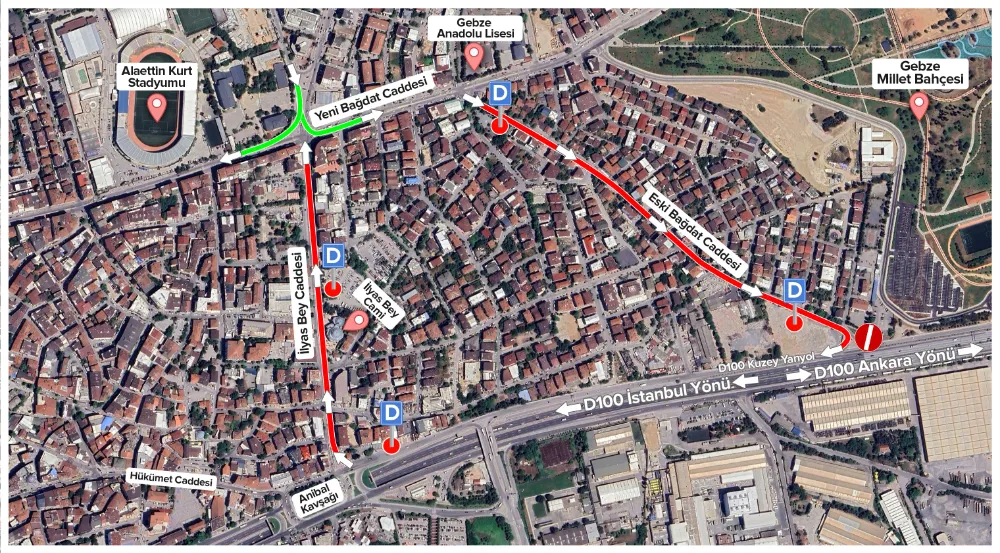 Yeni trafik dolaşım planına göre, D-100 Kuzey yan yoldan şehir merkezine gidecek araçlar, Gebze Millet Bahçesi Kavşağı ve Millet Bahçesi çevre yolundan Yeni Bağdat Caddesi’ne veya sonrasında ise D-100 Kuzey yan yolu takiben İlyasbey Caddesi’nden Yeni Bağdat Caddesi’ne erişebilecek. Şehir merkezinden D-100, D-100 Kuzey yan yol ve Anibal Kavşağı’na gidecek araçlar ise Eski Bağdat Caddesi’ni kullanacak.