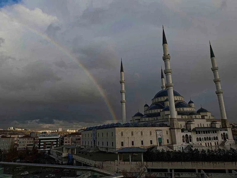 Ankara’nın simgelerinden olan Kocatepe Camii semalarında yağmur sonrası gökkuşağı oluştu.