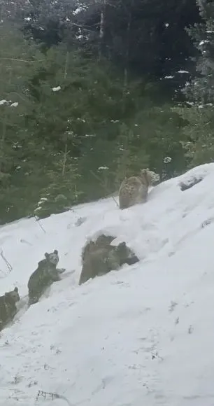 Bölgede seyir halindeki bir araçtan kaydedilen görüntülerde, karayolu üzerinde görülen 4 boz ayının bir süre yol üzerinde ilerlediği, ardından yoldan çıkarak yolun üst tarafına geçtiği ve ormanlık alana doğru yöneldiği görüldü. Kış mevsiminin etkisini sürdürdüğü bölgede ayıların kış uykusuna yatmaması dikkat çekerken, ortaya çıkan görüntüler yaban hayatındaki hareketliliği gözler önüne serdi.