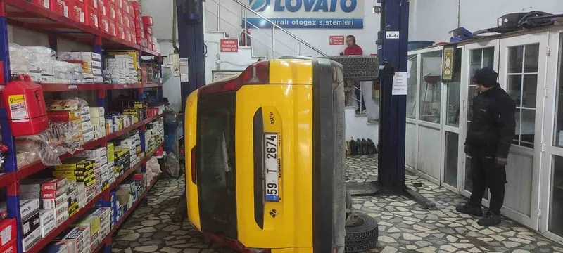 Çerkezköy ilçesinde bakım için oto servisine bırakılan bir taksi, liftte bulunduğu sırada henüz bilinmeyen bir sebeple düşerek hasar gördü. Olayda şans eseri yaralanan olmazken, takside göçükler ve ezilmeler meydana geldi. Olay anı güvenlik kameralarına yansırken, başlatılan inceleme sürüyor.