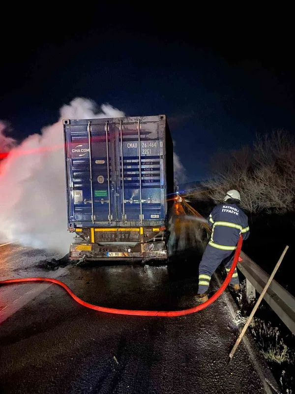 Balatalarından tutuşan tırdaki yangın kısa sürede söndürüldü