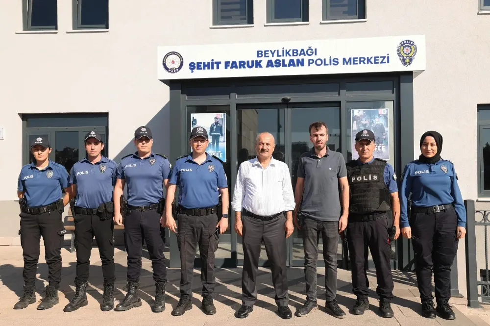Şehit Faruk Aslan Polis Merkezi’nde görevli emniyet mensupları da Başkan Büyükgöz’e ziyaretlerinden ve desteklerinden ötürü teşekkür etti. Cumhuriyet Mahallesi Yeni Bağdat Caddesi No 85 adresinde Beylikbağı bölgesine hizmet veren Şehit Faruk Aslan Polis Merkezi, 900 metrekare kapalı alan ve 1700 metrekare de açık alan üzerinde inşa edildi.