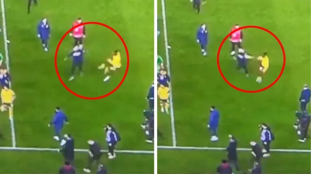 Yeşil sahanın karıştığı o anlarda ise Fenerbahçe'nin yıldız oyuncusu Michy Batshuayi ise, kendisine saldırdığını düşündüğü bir Trabzonspor taraftarına döner tekme attı.