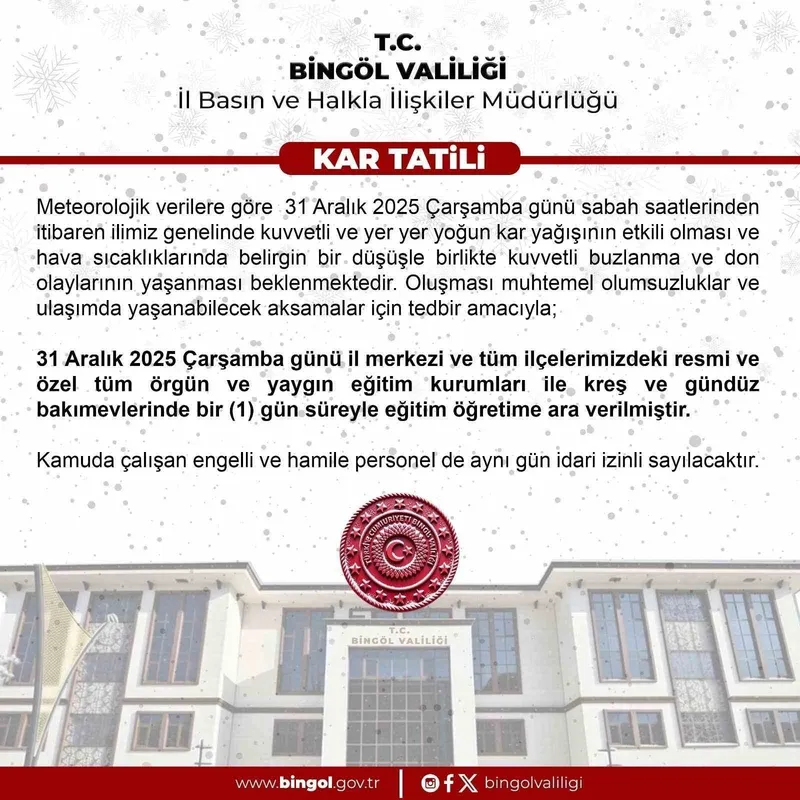 Bingöl tarafından yapılan açıklamada, "Meteorolojik verilere göre 31 Aralık 2025 Çarşamba günü sabah saatlerinden itibaren ilimiz genelinde kuvvetli ve yer yer yoğun kar yağışının etkili olması ve hava sıcaklıklarında belirgin bir düşüşle birlikte kuvvetli buzlanma ve don olaylarının yaşanması beklenmektedir. Oluşması muhtemel olumsuzluklar ve ulaşımda yaşanabilecek aksamalar için tedbir amacıyla; 31 Aralık 2025 Çarşamba günü il merkezi ve tüm ilçelerimizdeki resmi ve özel tüm örgün ve yaygın eğitim kurumları ile kreş ve gündüz bakımevlerinde 1 gün süreyle eğitim öğretime ara verilmiştir" denildi.
