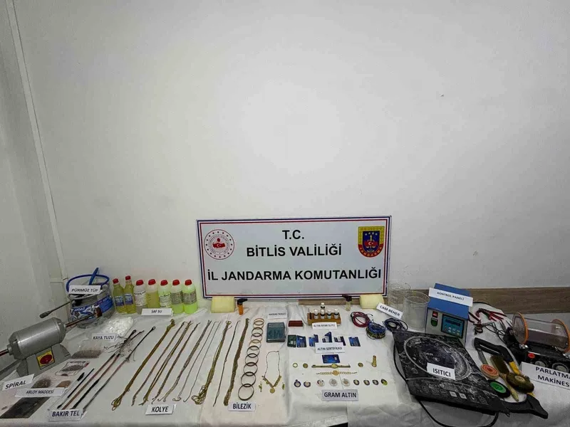Bitlis İl Jandarma Komutanlığı Kaçakçılık ve Organize Suçlarla Mücadele Şubesi ekiplerince yapılan teknik ve fiziki takip sonucu, şüphelilerin gerçek gram altını eriterek bakır yoğunluklu materyallerle karıştırmak suretiyle sahte altın imal ettikleri ve piyasaya sürdükleri tespit edildi.