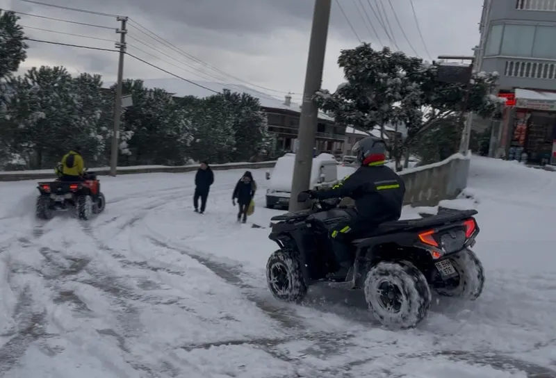 Mudanya’da bazı vatandaşlar dört tekerli motorlarıyla kar üzerinde sürüş yaparken, çocuklar sokaklara çıkarak kardan adam yaptı. Sokaklar adeta çocukların kar pistine döndü.