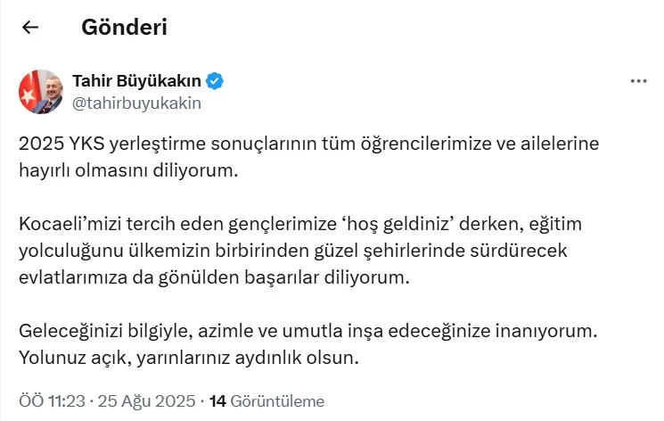 Yükseköğretim Kurumları Sınavı (YKS) 2025 yerleştirme sonuçları açıklandı. Kocaeli Büyükşehir Belediye Başkanı Doç.Dr.Tahir Büyükakın da istedikleri üniversitelere giren tüm öğrencileri unutmadı. Öğrencileri tebrik eden ve yeni eğitim hayatlarında başarılar dileyen Başkan Büyükakın, “2025 YKS yerleştirme sonuçlarının tüm öğrencilerimize ve ailelerine hayırlı olmasını diliyorum. Kocaeli’mizi tercih eden gençlerimize ‘hoş geldiniz’ derken, eğitim yolculuğunu ülkemizin birbirinden güzel şehirlerinde sürdürecek evlatlarımıza da gönülden başarılar diliyorum. Geleceğinizi bilgiyle, azimle ve umutla inşa edeceğinize inanıyorum. Yolunuz açık, yarınlarınız aydınlık olsun” ifadesini kullandı.