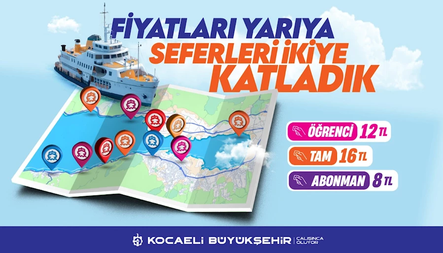 Kocaeli Büyükşehir Belediyesi, 8 Eylül Pazartesi günü itibarıyla deniz ulaşımında kış tarifesine geçiyor. Yeni tarife ile birlikte hem sefer sayıları artırılıyor hem de ücretler yarı yarıya indiriliyor. Yeni uygulamanın, Başiskele Kavşağı Koridor Projesi kapsamında devam eden çalışmalar sırasında vatandaşlara hem kolaylık sağlaması, hem zaman hem de ekonomik açıdan katkı sunması bekleniyor.