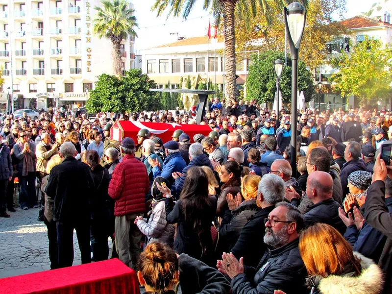 Çeşme’de 20 yıl belediye başkanlığı yapan Ahmet Faik Tütüncüoğlu (88), 20 Aralık’ta yaşamını yitirdi. Tütüncüoğlu’nun Türk bayrağına sarılı naaşı askeri törenin yapılacağı Çeşme Belediyesi önüne getirildi.