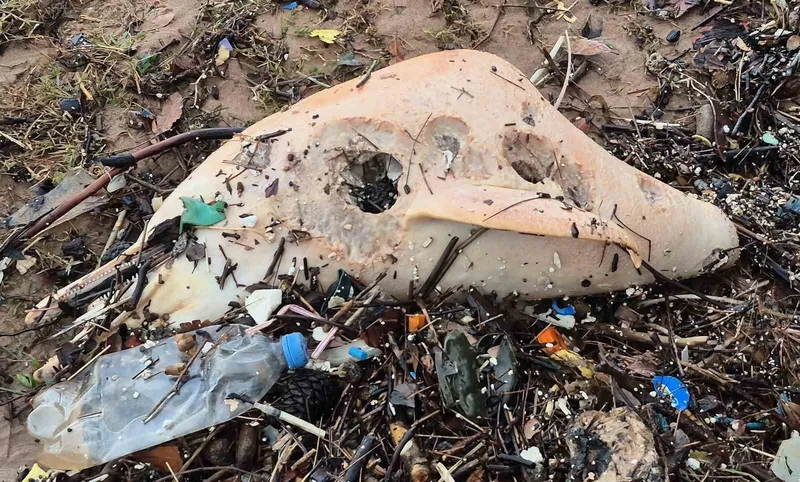 Dev dalgalar, ölü yunus balığının kalıntılarını sahile sürükledi