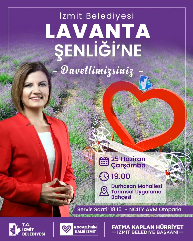 İzmit Belediyesi Kırsal Hizmetler Müdürlüğü tarafından geleneksel hale getirilen ve her yıl büyük bir ilgiyle beklenen Lavanta Şenliği, bu yıl da morun huzur veren tonlarını ve doğanın büyüleyici kokusunu bir araya getiriyor. 25 Haziran Çarşamba akşamı saat 19.00’da gerçekleşecek etkinlik, doğa tutkunlarını ve fotoğraf meraklılarını bir araya getirecek.