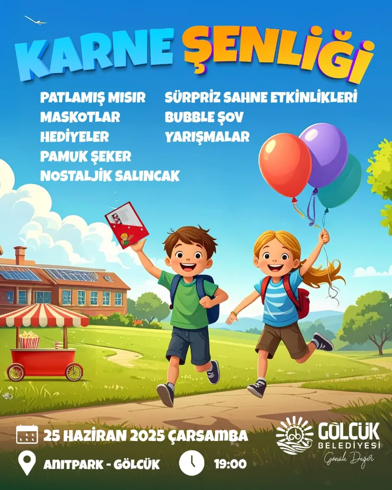 Gölcük Belediyesi, 2024-2025 eğitim-öğretim yılını tamamlayarak yaz tatiline giren çocuklara eğlence dolu bir karne tatili sunmaya hazırlanıyor. Bu kapsamda Gölcük Belediyesi; yaz tatiline giren çocuklar için Karne Şenliği düzenleyecek. 25 Haziran Çarşamba günü saat 19.00’da Anıtpark’ta gerçekleştirilecek şenlikte çocuklar, birbirinden eğlenceli etkinlikler ile yaz tatiline merhaba diyecek.
