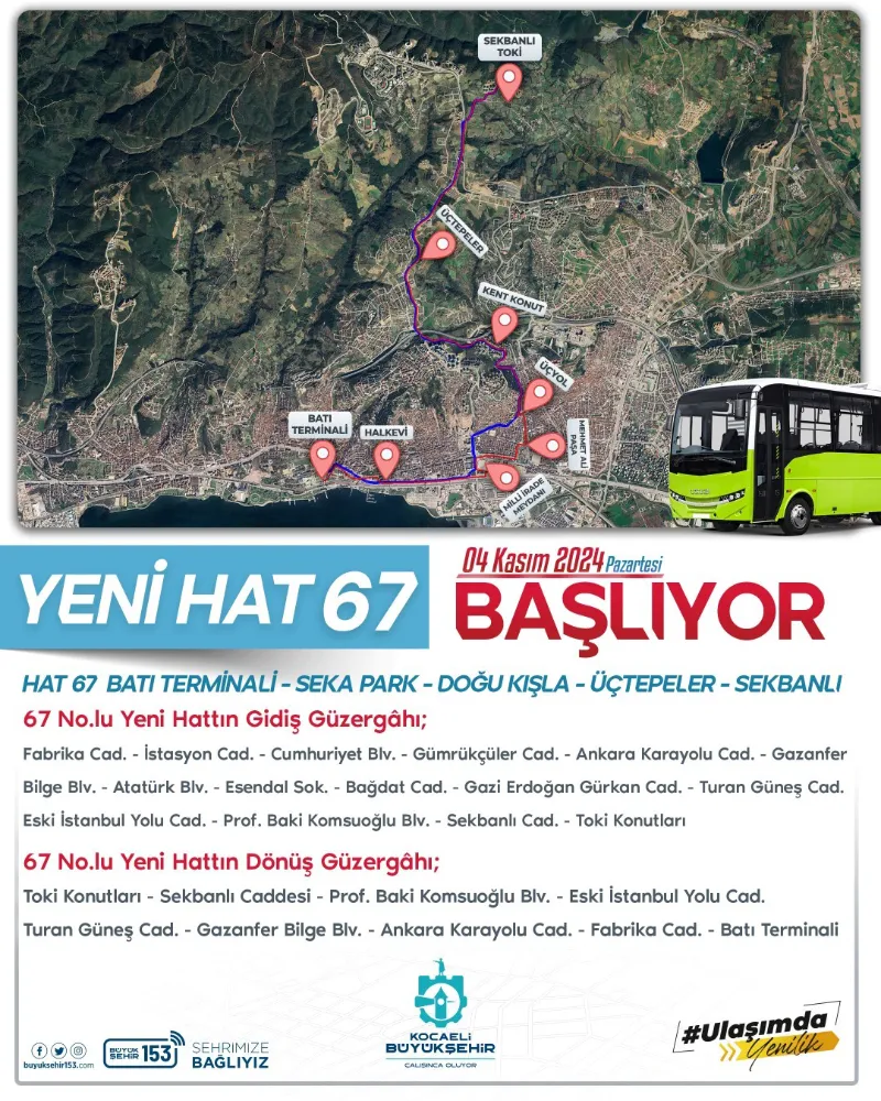 Kocaeli Büyükşehir Belediyesi vatandaşların ulaşım imkanlarından en iyi şekilde faydalanması için yeni hatlar kurmaya devam ediyor. Bu kapsamda Sekbanlı TOKİ Konutları–Batı Terminali arasında hizmet verecek olan HAT 67, 04 Kasım Pazartesi günü seferlerine başlıyor. HAT 67’in güzergahı ise şu şekilde;