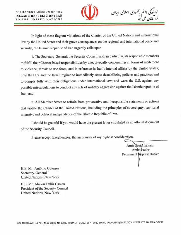 BM Genel Sekreteri Antonio Guterres, BM Güvenlik Konseyi ve konsey üyesi ülkelere ABD’nin İran’ın iç işlerine müdahalesine ve güç kullanma tehditlerine karşı çıkma çağrısı yapan İravani, "Tüm üye devletler, İran İslam Cumhuriyeti’nin egemenliği, toprak bütünlüğü ve siyasi bağımsızlığı ilkeleri dahil BM Şartı’nı ihlal eden kışkırtıcı ve sorumsuz açıklamalardan veya eylemlerden kaçınmalıdır" ifadelerine yer verdi. İravani, gönderdiği mektubun resmi bir belge olarak BM Güvenlik Konseyi üyesi ülkelere dağıtılmasını talep etti.