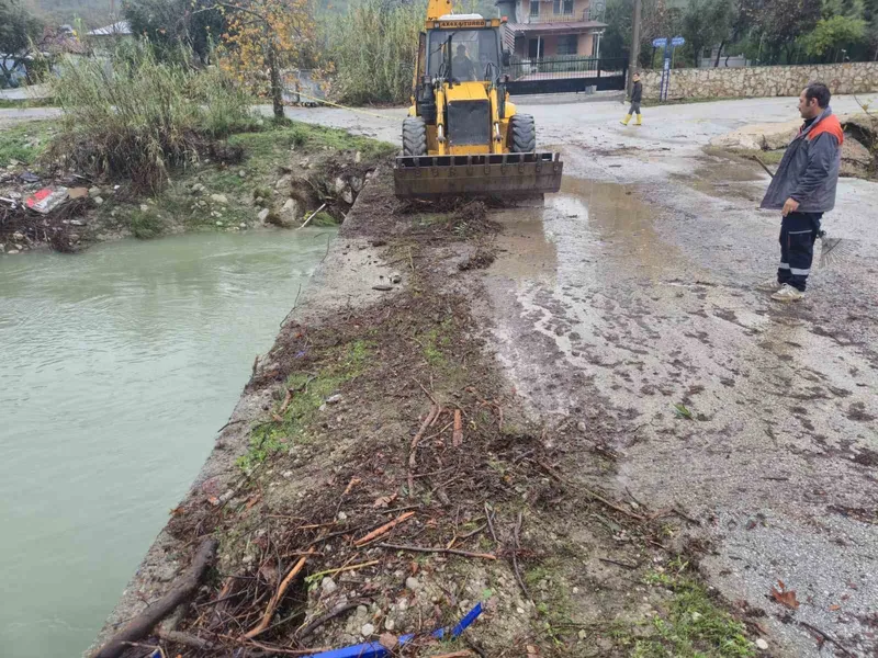 Kemer Belediye ekipleri, Beldibi Mahallesi’nde şiddetli sağanak nedeniyle dağlık alandan koparak akıntıyla birlikte gelen ve köprüleri tıkayan tomruklar ile atıkların temizliğini yaptı.