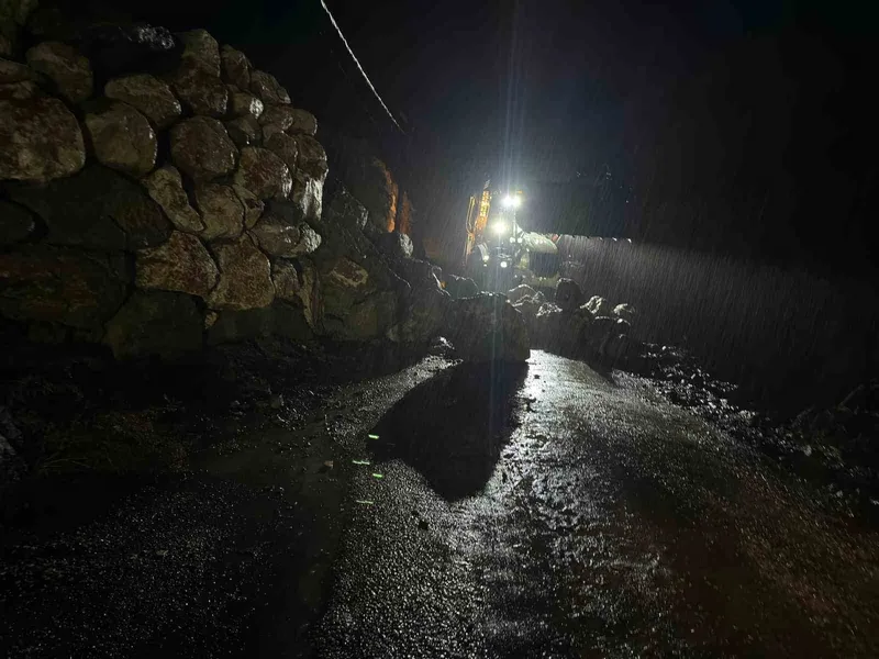 Kemer Belediye Fen İşleri Müdürlüğü ekipleri, istinat duvarının çöktüğü bölgeye ulaşarak trafiğe kapanan yolu belediye araçlarıyla açtı.