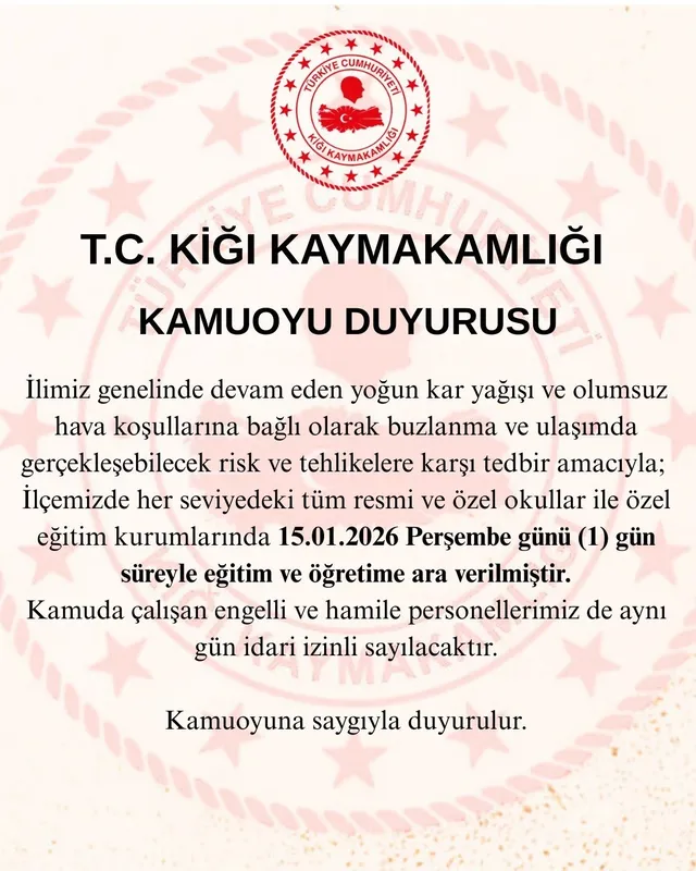Kiğı’da kar yağışının ardından aşırı buzlanma ve don olayları devam ediyor. Bu çerçevede Kiğı kaymakamlığı tarafından yapılan açıklamada, buzlanma ve ulaşımda yaşanacak olumsuzluklar nedeniyle, 15 Ocak 2026 Perşembe günü ilçe genelinde eğitim ve öğretime 1 gün ara verildiğini ve aynı gün kamuda çalışan hamile ve engelli personellerin idari izinli sayılacağını duyurdu.
