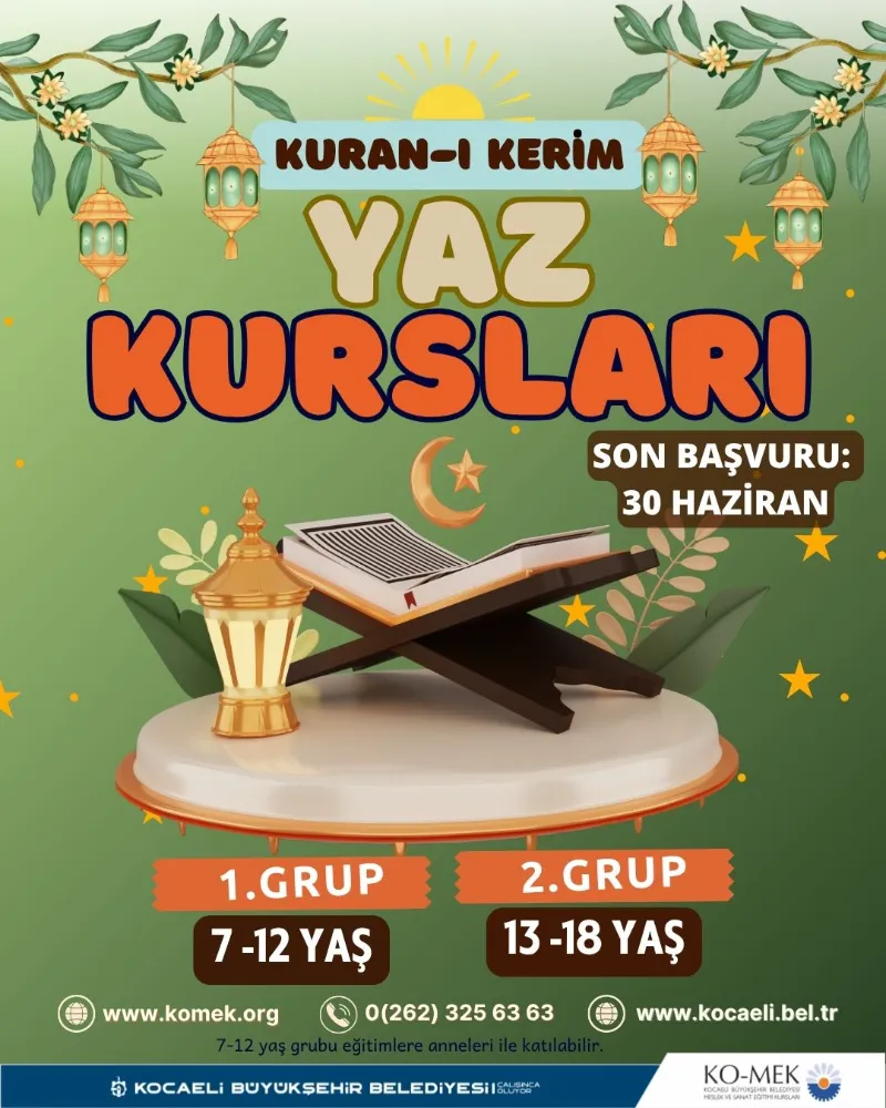 Kocaeli Büyükşehir Belediyesi Meslek ve Sanat Eğitim Kursları (KO-MEK), gerçekleştireceği birbirinden önemli eğitim projeleriyle bu yaz dönemine de hızlı giriyor. Yaz boyunca çocuklara ve gençlere yönelik en önemli eğitim ise Kur’an-ı Kerim Yaz Kursu olacak. 12 ilçede ve 40 ayrı kurs merkezinde planlanan dersler, 30 Haziran-25 Temmuz tarihleri arasını kapsayan süreçte haftanın 5 günü 10.00-15.00 saatleri arasında verilecek. 7-12 yaş arasındaki çocuklar ile 12-16 yaş arasındaki gençler ayrı ayrı eğitim alacak.