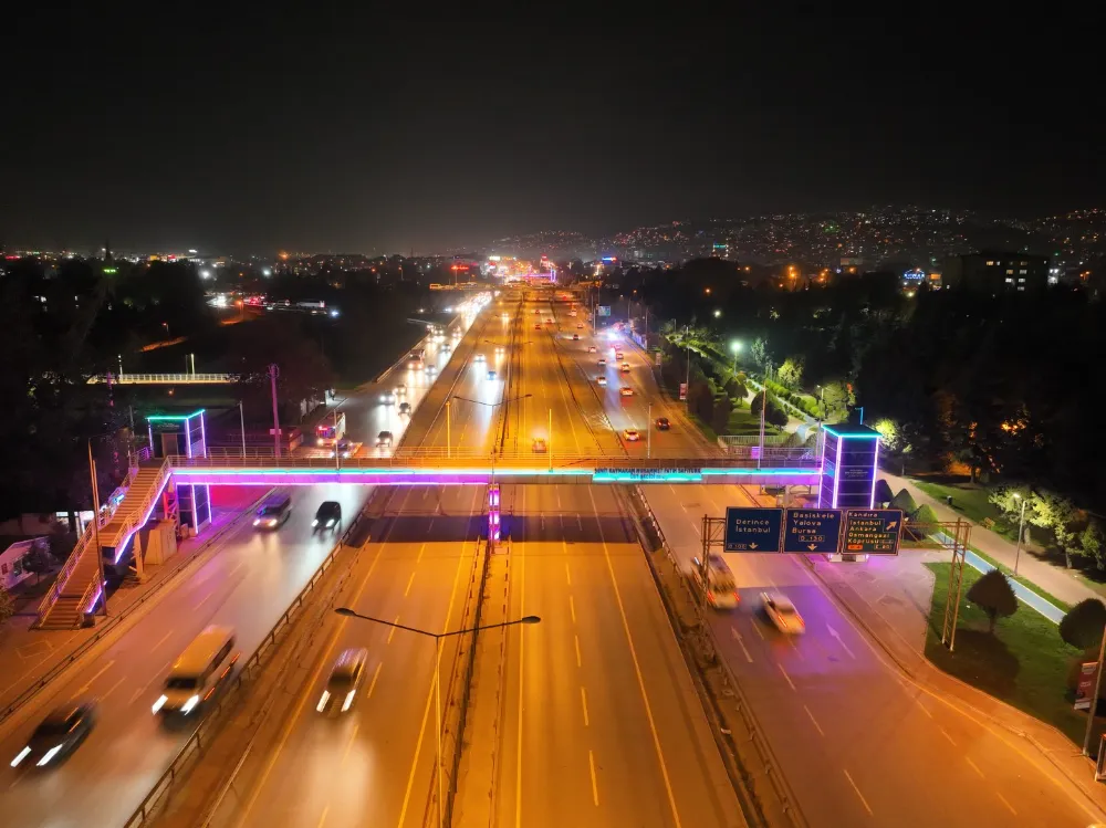 Kocaeli’de önemli günlerde renk ve ışık gösterileriyle aydınlatılan üst geçitler bu kez Bilişim Fuarı için turkuaz ve mor ışıklarla aydınlatıldı.