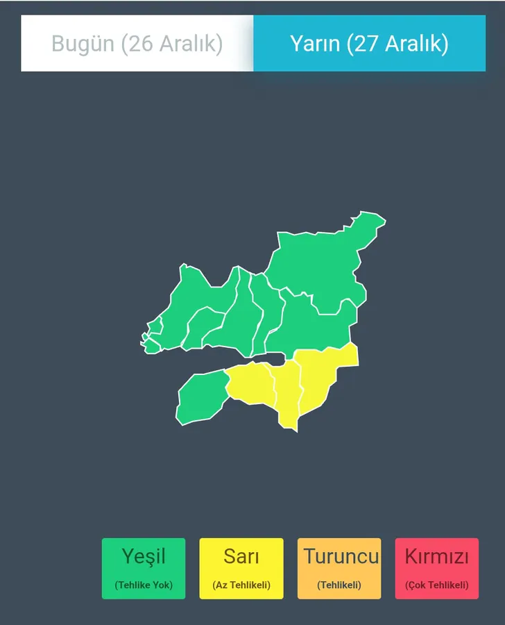 26.12.2025 Cuma günü gece saatlerinden sonra Kocaeli’nin güneyinin (Kartepe, Başiskele, Gölcük) yükseklerinde kuvvetli (5-20 cm) kar yağışları beklenmektedir.