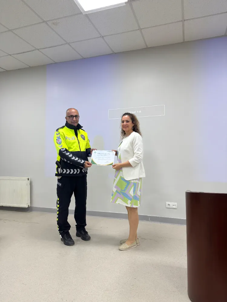 Trafik polisi Ferhat Çetinkaya tarafından gerçekleştirilen eğitimde trafik güvenliği konusunda bilgilendirme yapıldı. Eğitim sunumu takiben katılımcıların sorularının cevaplanması ile son buldu. Eğitim sonunda Okul Müdürü Prof. Dr. Arzu Morkoyunlu sayın Ferhat Çetinkaya'ya teşekkür belgesi sundu.