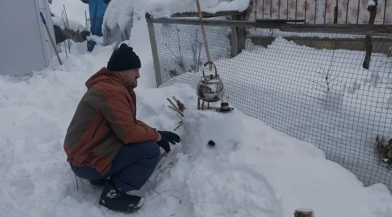 Soğuk havaya aldırış etmeden çayını demleyip içen Demirkaya, kar yağışının tadını çıkararak renkli görüntüler oluşturdu. Vatandaşların ilgisini çeken kardan soba görenleri hem şaşırttı hem de gülümsetti.