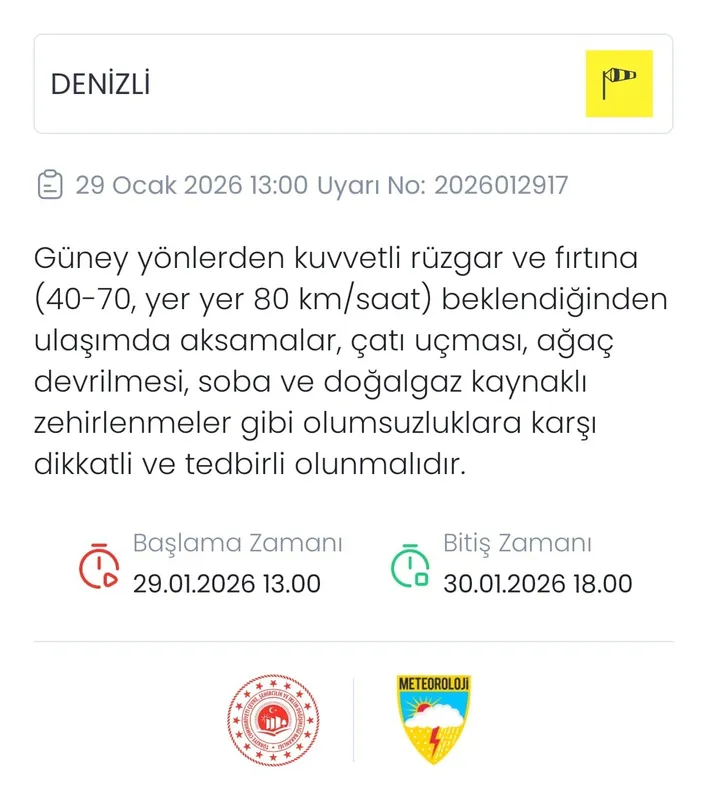 Meteoroloji Genel Müdürlüğü, Denizli için kuvvetli rüzgar ve fırtına uyarısında bulundu. Yapılan açıklamaya göre, 29 Ocak 2026 Perşembe günü saat 13.00’ten itibaren güney yönlerden kuvvetli rüzgar ve yer yer fırtına bekleniyor. Rüzgarın saatte 40 ila 70 kilometre hızla esmesi, bazı bölgelerde ise hızının 80 kilometreye kadar çıkması öngörülüyor. Meteoroloji, olumsuz hava şartları nedeniyle ulaşımda aksamalar, çatı uçması, ağaç ve direk devrilmesi gibi risklere karşı dikkatli olunması gerektiğini belirtti.
