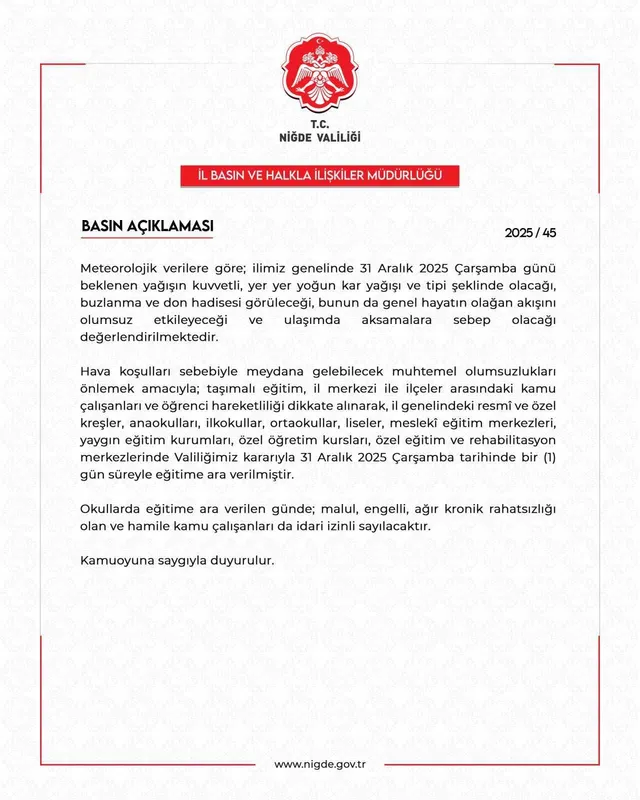 Valilik tarafından yapılan açıklamada meteorolojik verilere göre 31 Aralık 2025 Çarşamba günü Niğde genelinde kuvvetli, yer yer yoğun kar yağışı ve tipi beklendiği, buzlanma ve don olaylarının görülebileceği belirtildi.