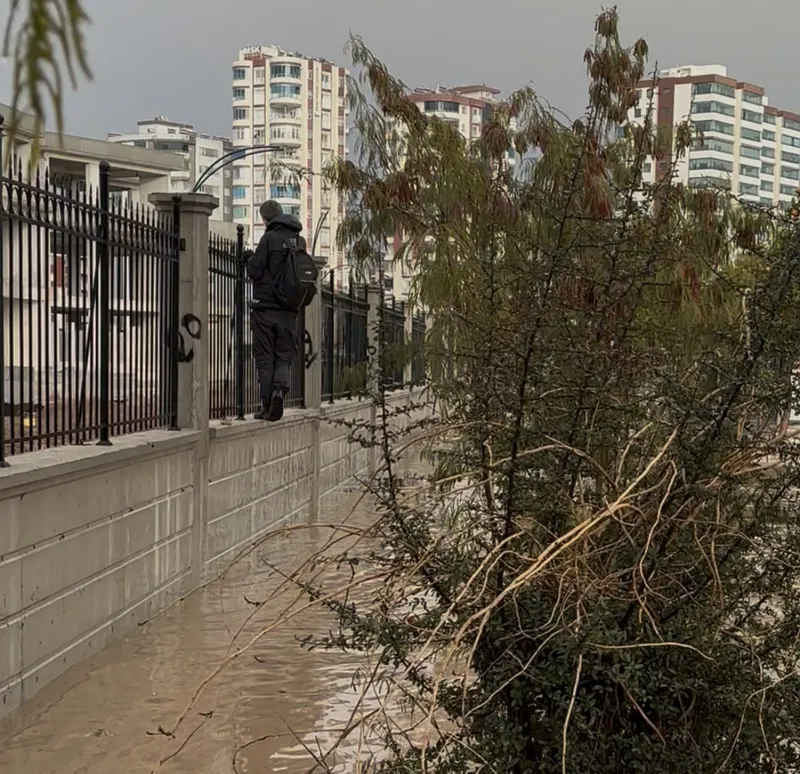 Adana’da etkili olan sağanak yağış nedeniyle cadde ve sokaklar göle dönerken, bir vatandaş karşı yola hastane duvarına tırmanarak geçti.
