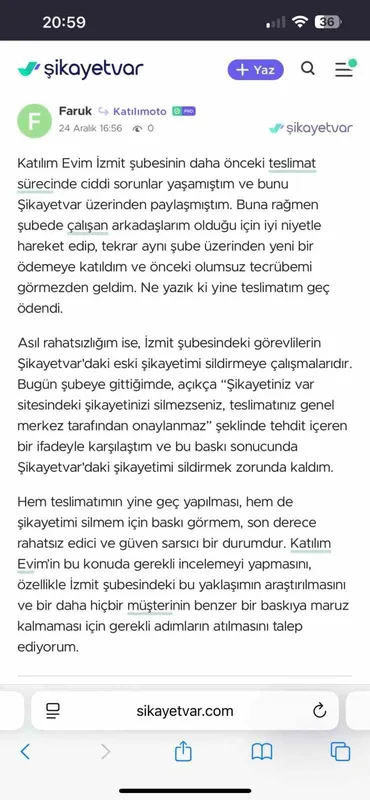 Yaşadığını süreci anlatan vatandaş, "Katılım Evim İzmit şubesinin daha önceki teslimat sürecinde ciddi sıkıntılar yaşamıştım ve bunu ’Şikayetvar’ üzerinden paylaşmıştım. Buna rağmen şubede çalışan arkadaşlarım olduğu için iyi niyetle hareket edip, tekrar aynı şube üzerinden yeni bir ödemeye katıldım ve önceki olumsuz tecrübemi görmezden geldim. Ne yazık ki yine teslimatım geç ödendi. Asıl rahatsızlığım ise, İzmit şubesindeki görevlilerin Şikayetvar’daki eski şikayetimi sildirmeye çalışmalarıdır. Bugün şubeye gittiğimde açıkça, "Şikayetinizi silmezseniz, teslimatınız genel merkez tarafından onaylanmaz" şeklinde tehdit içeren bir ifadeyle karşılaştım ve bu baskı sonucunda Şikayetvar’daki şikayetimi sildirmek zorunda kaldım. Hem teslimatımın yine geç yapılması, hem de şikayetimi silmem için baskı görmem, son derece rahatsız edici ve güven sarsıcı bir durumdur. Katılım Evim’in bu konuda gerekli incelemeyi yapmasını, özellikle İzmit şubesindeki bu yaklaşımın araştırılmasını ve bir daha hiçbir müşterinin benzer bir baskıya maruz kalmaması için gerekli adımların atılmasını talep ediyorum" dedi.