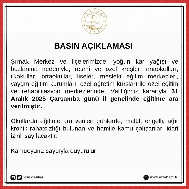 Şırnak Valiliğinden yapılan açıklamada, ‘’Şırnak merkez ve ilçelerimizde, yoğun kar yağışı ve buzlanma nedeniyle resmi ve özel kreşler, anaokulları, ilkokullar, ortaokullar, liseler, meslekî eğitim merkezleri, yaygın eğitim kurumları, özel öğretim kursları ile özel eğitim ve rehabilitasyon merkezlerinde, valiliğimiz kararıyla 31 Aralık 2025 Çarşamba günü il genelinde eğitime ara verilmiştir. Okullarda eğitime ara verilen günlerde malul, engelli, ağır kronik rahatsızlığı bulunan ve hamile kamu çalışanları idari izinli sayılacaktır’’ denildi.