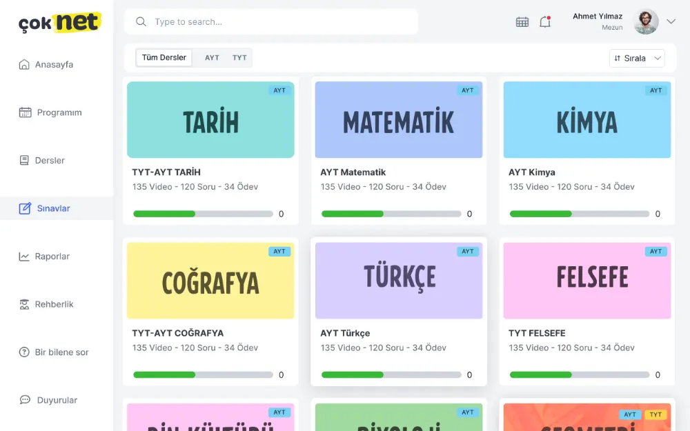 Çok Net’te 5.200’den fazla video ders, 100.000+ video çözümlü soru ve Türkiye geneli online deneme sınavı yer alıyor. İçerikler, güncel müfredata ve ÖSYM soru formatına uygun olarak hazırlanıyor.