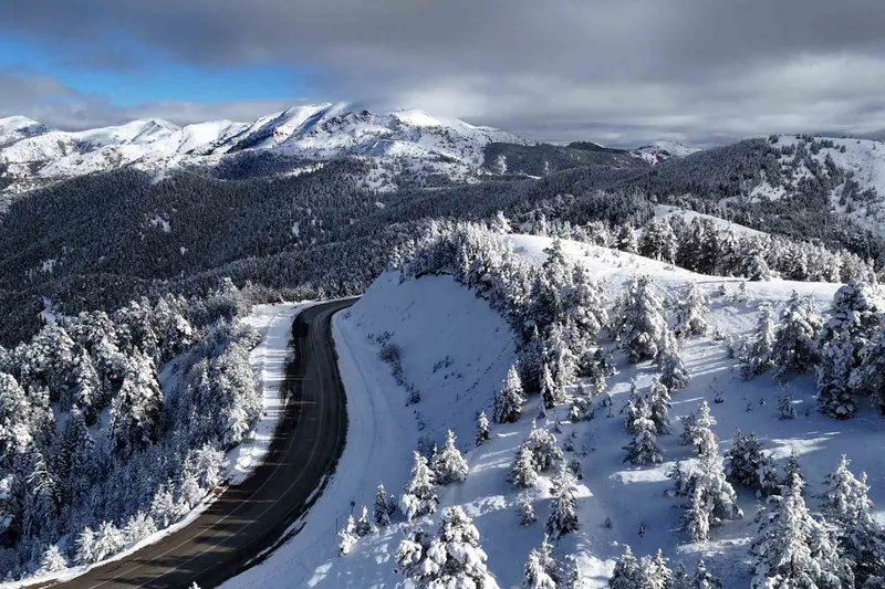 Drone çekimlerine yansıyan görüntülerde, kar altındaki kıvrımlı yolların arasından süzülen araçlar, doğanın gücü karşısındaki mücadeleyi gözler önüne seriyor. Bölgedeki ormanlık alanlar, devasa ağaçların dallarındaki kar kütleleriyle kışın tüm görkemini yansıtıyor.