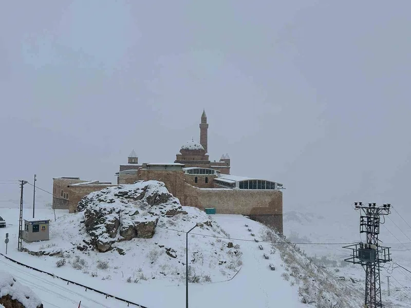 Ağrı’nın Doğubayazıt ilçesinde yer alan ve Osmanlı mimarisinin en önemli eserleri arasında gösterilen İshak Paşa Sarayı, etkili olan kar yağışıyla birlikte beyaza büründü. Tarihi yapı, karla bütünleşen ihtişamlı görünümüyle ziyaretçilerine görsel bir şölen sundu.