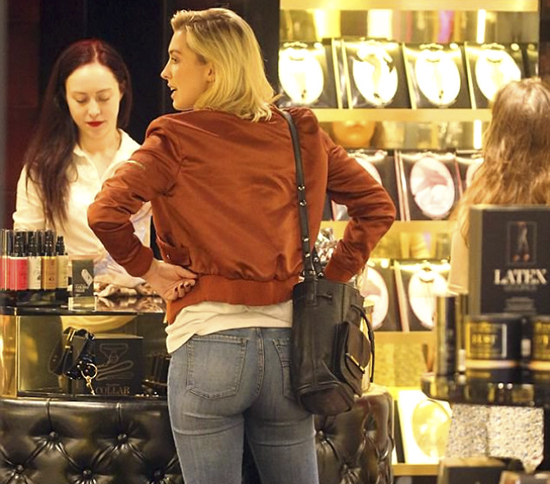 Ünlü yıldız uzun süre kaldığı markette birçok iç çamaşırı ve korse denedi. Alex Nation, denediği askılı jartiyerin üzerinde nasıl durduğunu görmek için markette bulunan boy aynası önünde kendine baktı.
